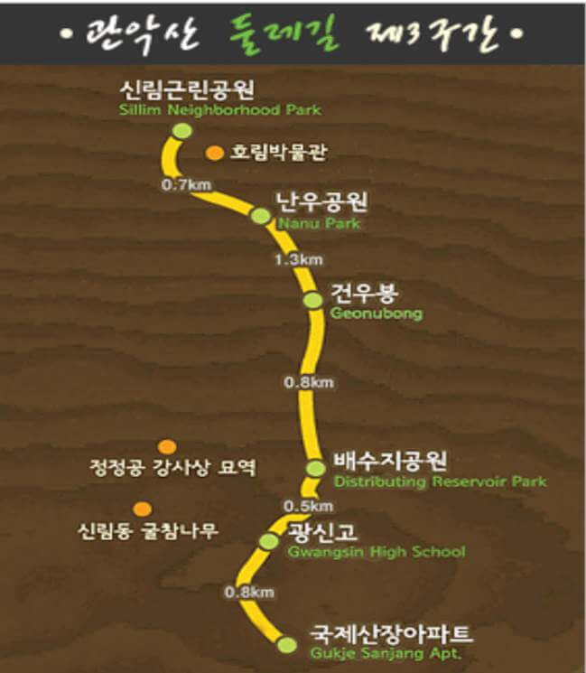 제3구간은 '사색의 숲길'로 불리며 조용한 숲길을 따라 사색과 명상을 즐길 수 있는 코스입니다. 국제산장아파트에서 출발하여 광신고, 배수지공원, 건우봉, 난우공원을 지나 신림근린공원까지 이어집니다.