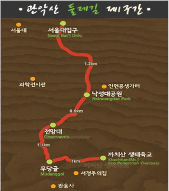 제1구간은 '애국의 숲길'로 불리며, 역사와 자연이 어우러진 코스입니다. 까치산생태육교에서 출발하면 무당골, 낙성대공원, 관악구청을 지나 서울대학교 정문까지 이어집니다. 이 구간은 강감찬 장군의 사당인 안국사와 생가터를 지나며 그의 애국정신을 느낄 수 있는 역사적인 장소들이 많습니다.