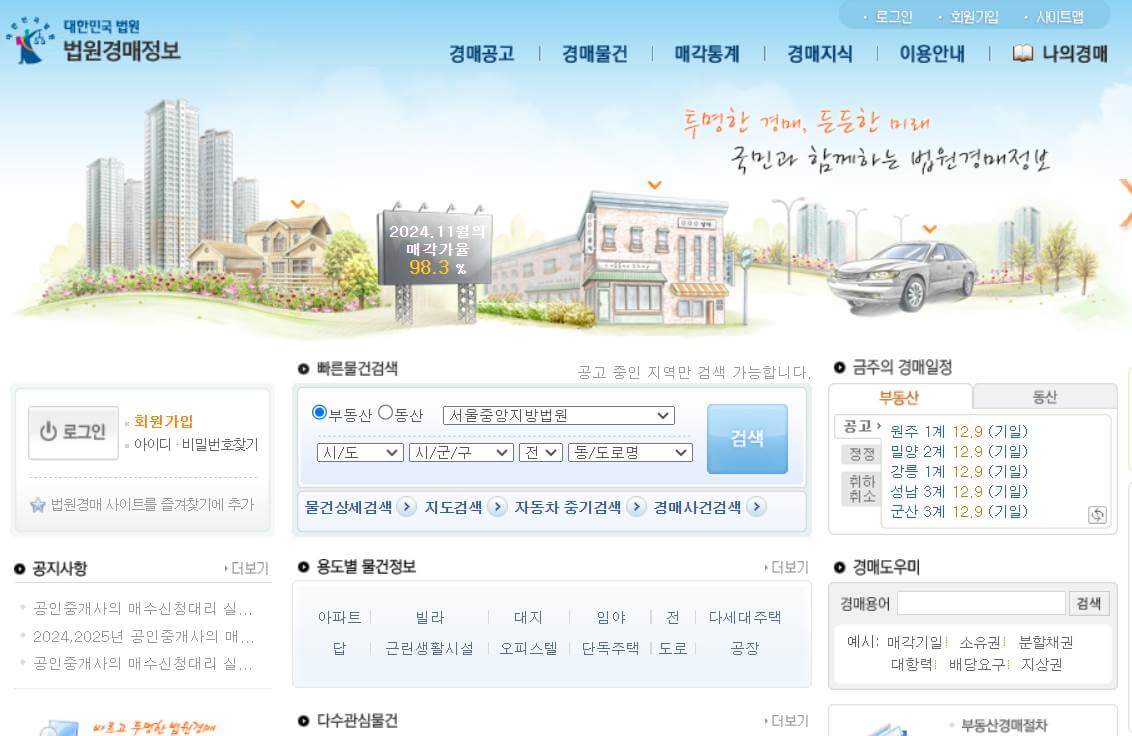 법원은 부동산 경매 대상 물건을 공고합니다. 공고는 주로 법원 경매 사이트나 공신력 있는 부동산 플랫폼에서 확인할 수 있습니다. 이 과정에서 물건의 기본 정보인 주소, 면적, 감정평가액 등이 공개됩니다. - 입찰