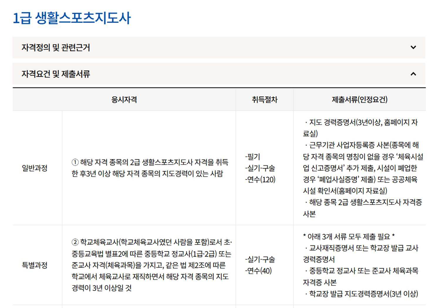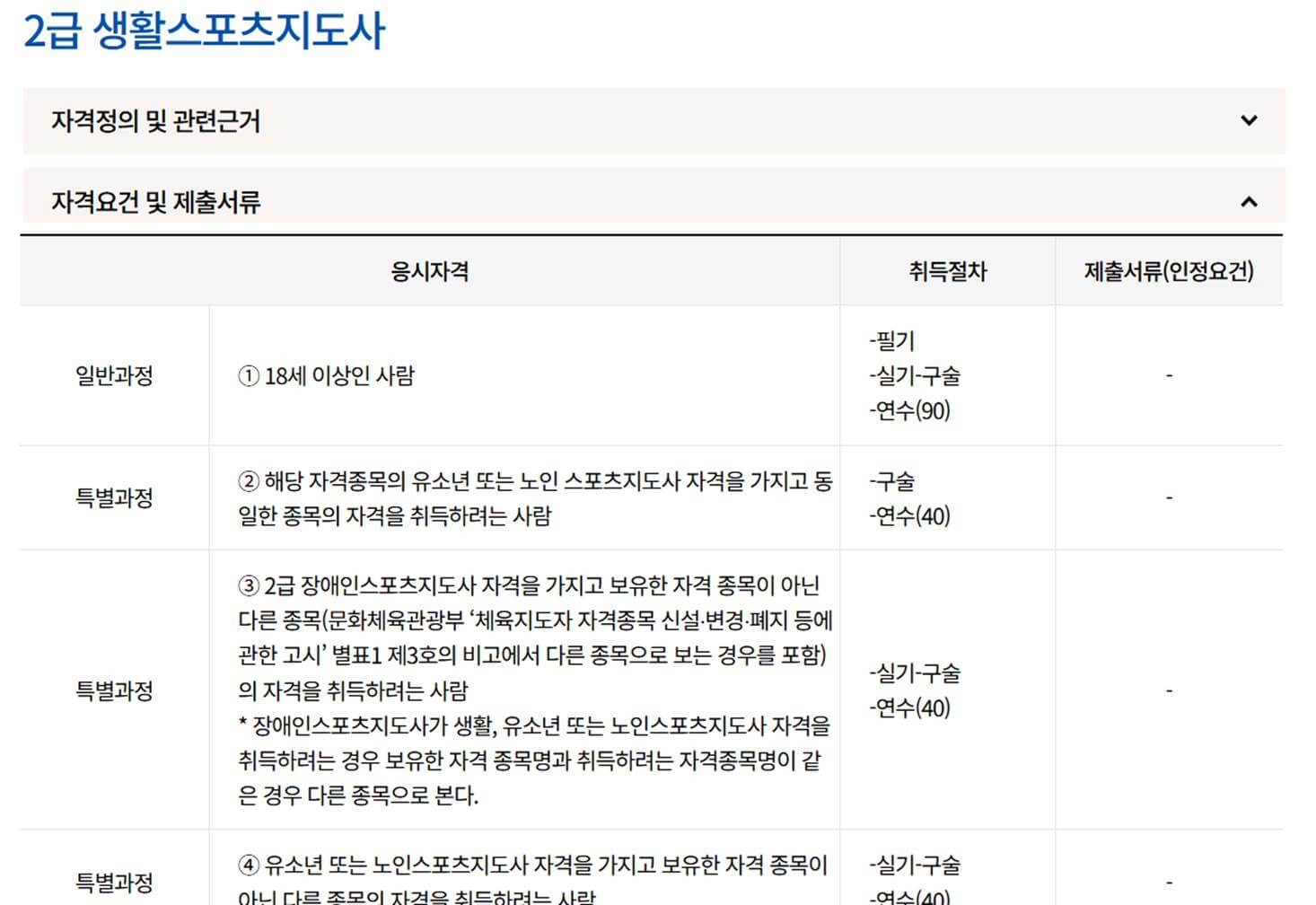 다만 위에 언급한 시험구성 내용은 '일반 과정'의 내용이며 만일 본인이 학교 체육교사였던지 선수경력이 있던 지 등의 특별한 이력이 있다면 취득 절차가 간소화 될 수 있으니 특별 과정이 궁금하신 분들은 아래에서 내용 확인 가능합니다.