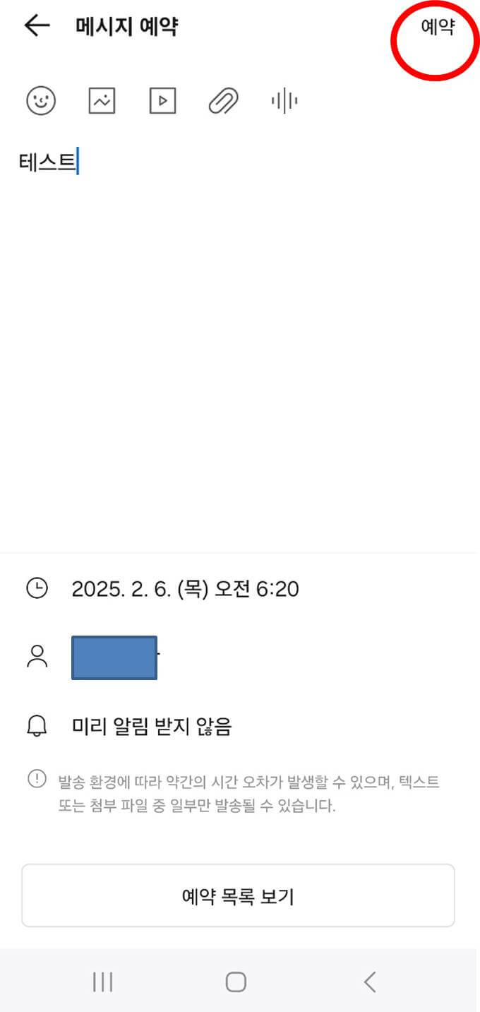 4. 여기서 보내고자 하는 예약 메시지를 작성하고 시간을 설정 후 오른쪽 상단의 '예약' 버튼을 누르면