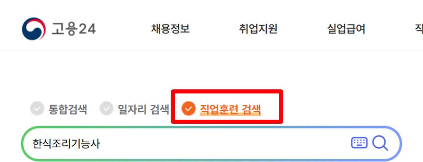 - 검색창 위에 '직업훈련'을 선택하고 검색창에서 ‘한식조리기능사’ 검색