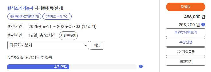 하지만 일반적으로 자격증 취득을 위한 학원 등록비 부담이 만만치 않기에 한식조리기능사 자격증을 취득하고자 한다면 국비지원 제도를 활용하는 것이 현명합니다.