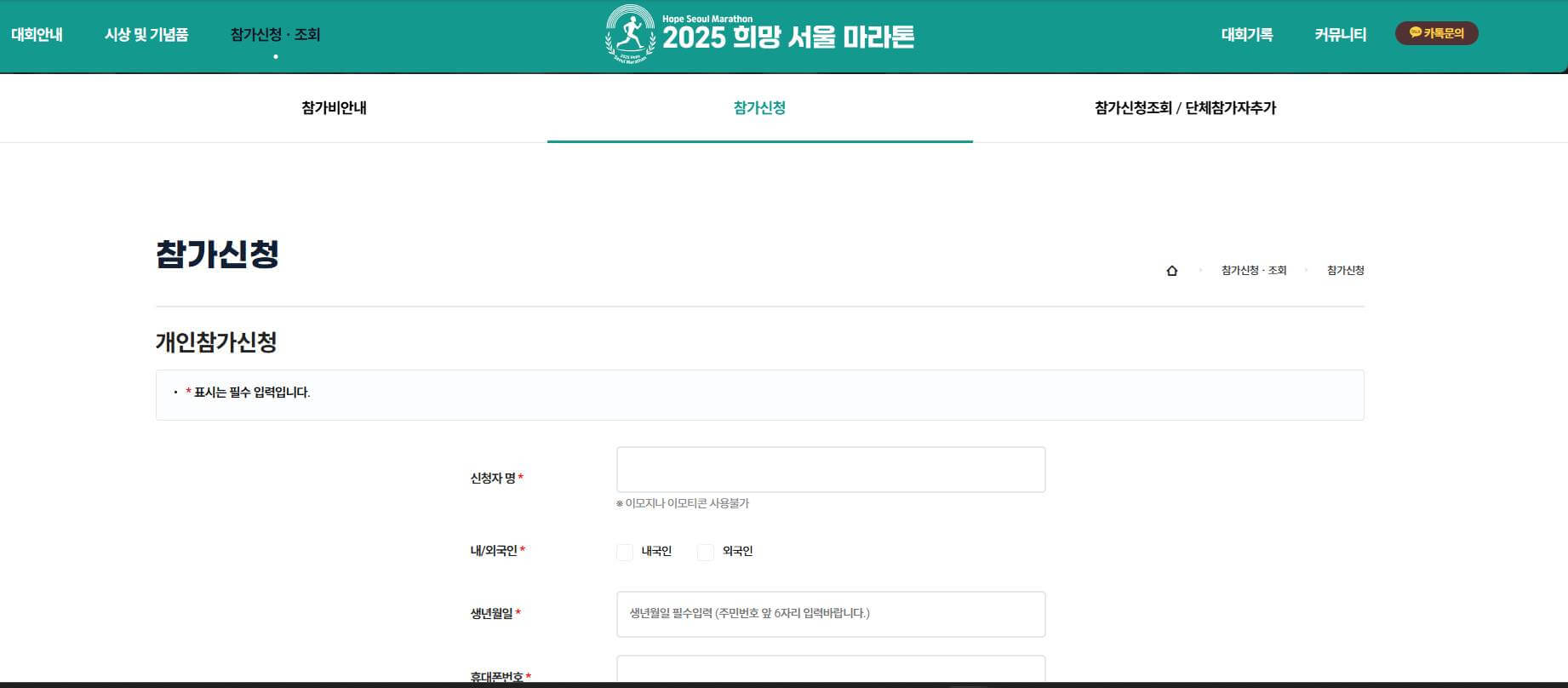 2025 희망서울마라톤 참가 신청은 대회 공식 홈페이지에서 신청 가능합니다. 대회 공식 홈페이지에 접속하여 필수 약관에 약관 동의 후 신청자 이름과 생년월일 그리고 휴대폰 번호 등의 정보를 입력하면 됩니다.